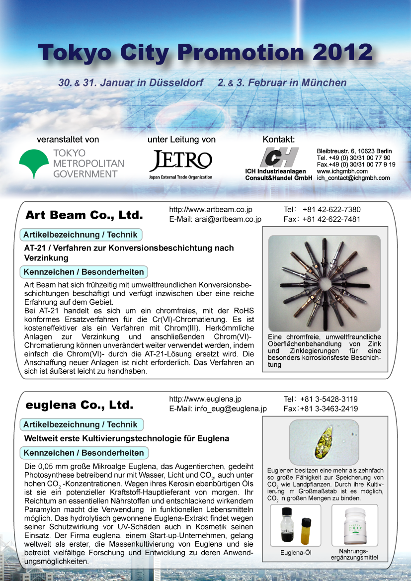 und Perspektiven des japanischen Marktes für deutsche Unternehmen vorgestellt werden. Nachdem 2010 vier und 2011 sieben mittelständische Unternehmen aus der Tokyoter Metropolregion an der Veranstaltung teilnahmen, werden sich 2012 fünf Firmen dem deutschen Publikum vorstellen. Sie werden interessierte Besucher in Düsseldorf am 30. und 31. Januar im Hotel Nikko (Immermannstraße 41, 40210 Düsseldorf, URL: www.nikko-hotel.de),und in München am 02. und 03. Februar im Münchner Maritim-Hotel (Goethestraße 7, 80336München, URL: www.maritim.de/de/hotels/deutschland/hotel-muenchen) erwarten.