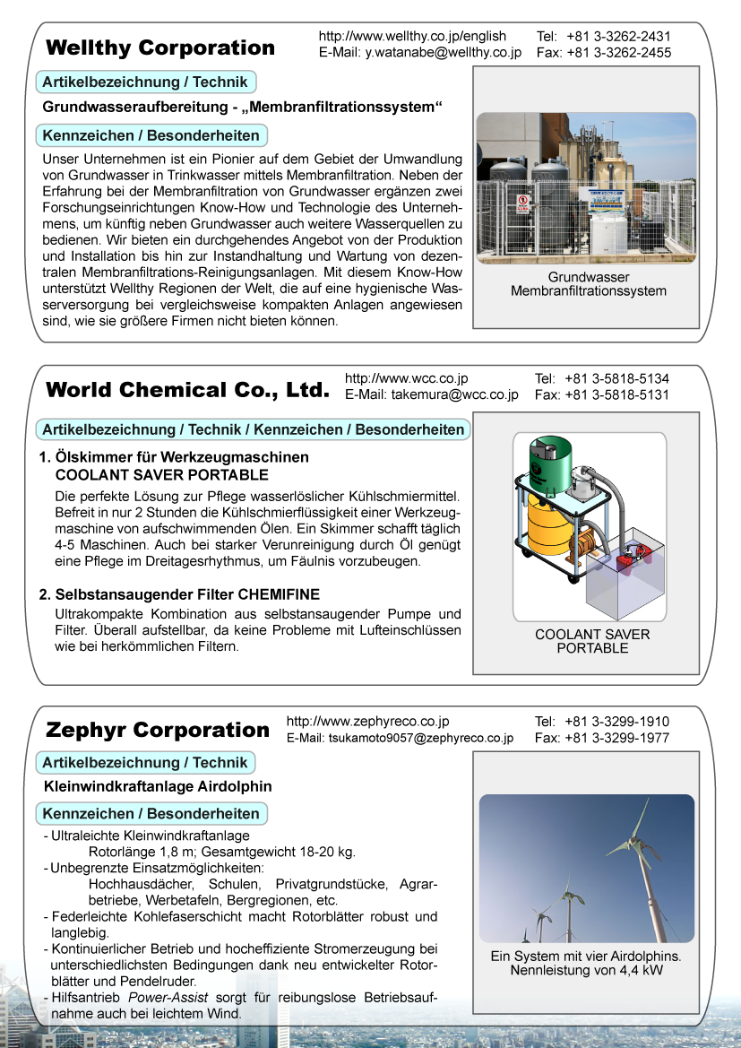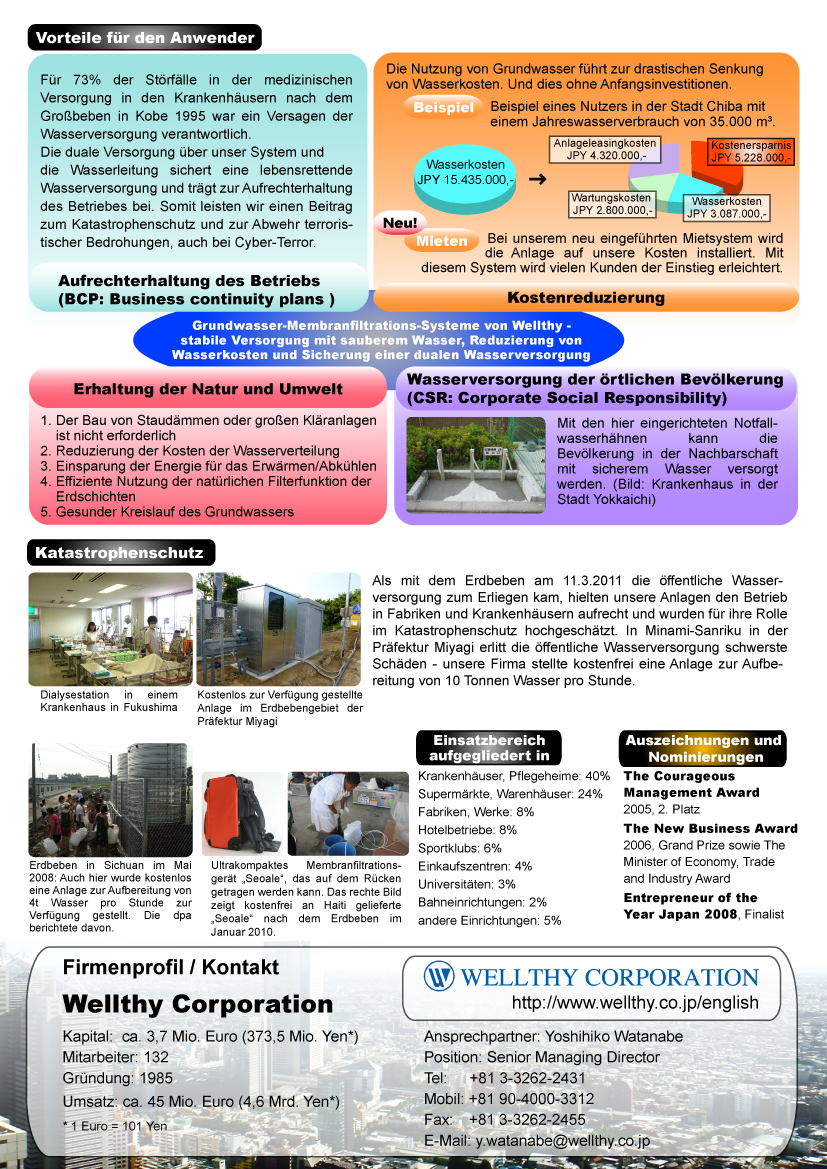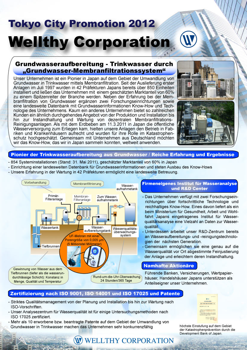 Als ein Pionier auf dem Gebiet der Umwandlung von Grundwasser in Trinkwasser in Japan verfügt Wellthy über reiche Erfahrung und baut sein Know-How durch den Betrieb zweier Forschungseinrichtungen sowie einer Datenbank mit Grundwasserinformationen für ganz Japan ständig aus. Seinen Kunden bietet die Firma eine durchgängige Betreuung von der Produktion und Installation bis hin zur Instandhaltung und Wartung von dezentralen Membranfiltrations-Reinigungsanlagen.