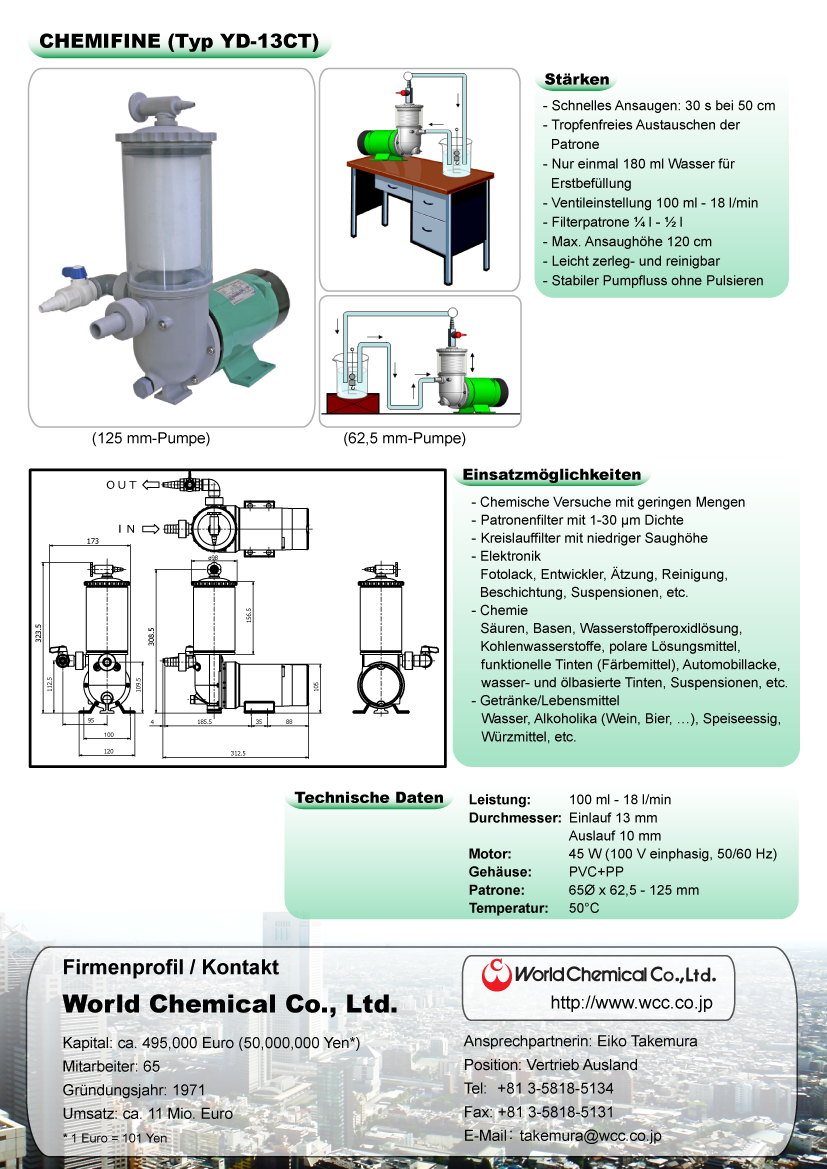 Das Unternehmen World Chemical ist ein Hersteller von hocheffizienten Pumpen-, Filter- und Skimmersystemen. In Deutschland wird man mit dem „Coolant Saver Portable“ einen hocheffizienten und schnell arbeitenden Ölskimmer für Werkzeugmaschinen vorstellen, der eine umweltfreundliche Abscheidung aufschwimmender Öle auch bei starken Niveauschwankungen des Behälters mittels eines patentierten Doppelschwimmers und auch das Abscheiden mit Spänen verunreinigter Öle durch Strudeltrichter ermöglicht. Mit dem System CHEMIFINE stellt man desweiteren eine vielseitig verwendbare, ultrakompakte Kombination aus selbstansaugender Pumpe und Filtervor.