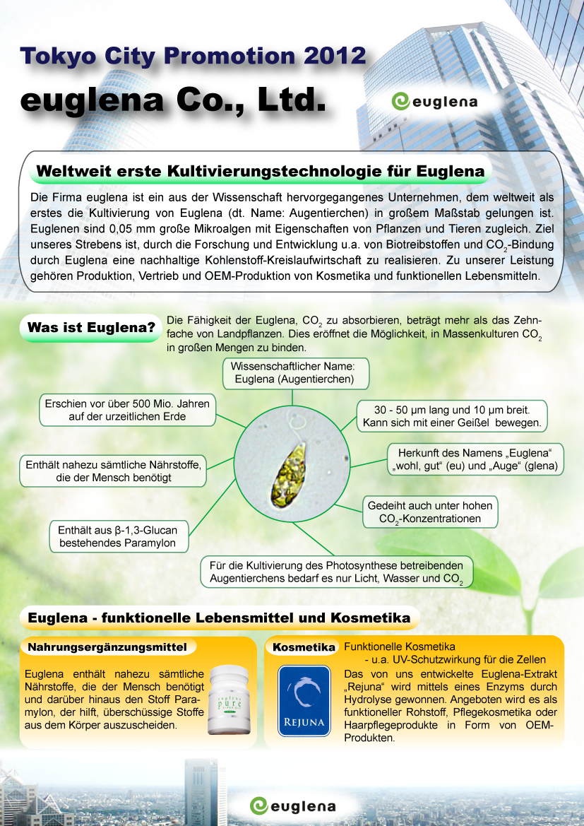 Euglena sind 0,05 mm große Mikroalgen, die sowohl tierische als auch pflanzliche Eigenschaften in sich tragen. Ihre Fähigkeit, CO2 in großen Mengen zu binden, und ihre Verwendbarkeit für die Erzeugung biologischer Treibstoffe machen die Mikroalgen zu einem interessanten Forschungsobjekt und vielseitig verwendbaren Ausgangsrohstoff. Das Unternehmen euglena Co., Ltd. hat sich zum Ziel gesetzt, durch Euglena eine nachhaltige Kohlenstoff-Kreislaufwirtschaft zu realisieren und erzeugt aus ihr bereits Kosmetika und funktionelle Lebensmittel.