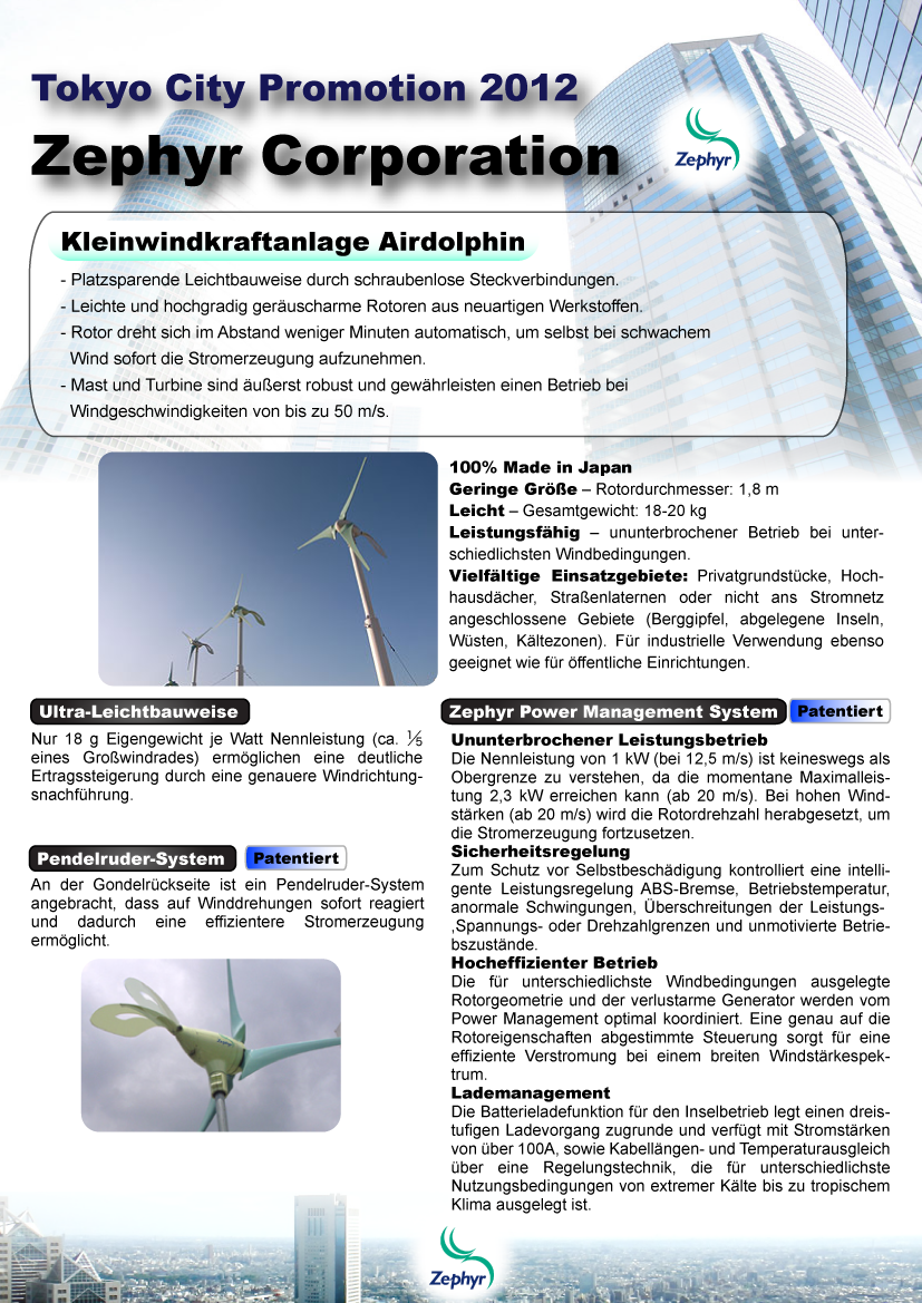 Mit dem Airdolphin stellt Zephyr eine Kleinwindkraftanlage vor, deren platz- und gewichtsparende Ultraleichtbauweise das Eigengewicht auf nur noch 18g je Watt Nennleistung (ca. ein Fünftel eines Großwindrades) senkt. Die kompakten Maße und leichte Installation ermöglichen einen einfachen Einsatz des Gerätes an vielfältigen Einsatzorten wie Privatgrundstücken, Hochhausdächern, Straßenlaternen oder in nicht ans Stromnetz angeschlossenen Gebieten (Berggipfel, abgelegene Inseln, Wüsten, Kältezonen). Die Anlagen sind damit für den hocheffizienten Betrieb in industrieller Verwendung ebenso geeignet wie für den Einsatz in öffentlichen Einrichtungen. Sie zeichnen sich durch ununterbrochenen Betrieb auch bei unterschiedlichsten Windbedingungen aus und sind dabei durch eine intelligente Leistungsregelung vor Selbstbeschädigung geschützt.