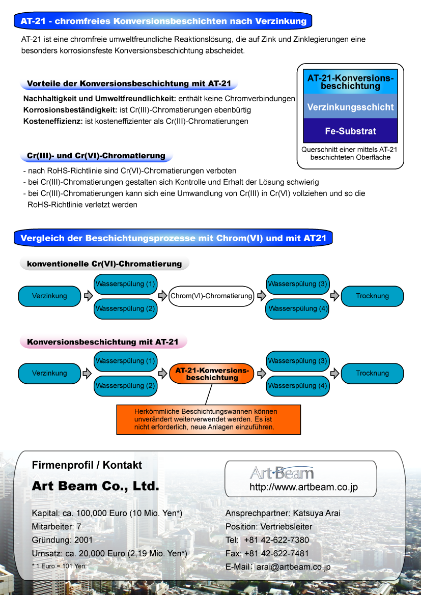 Das Unternehmen Art Beam stellt mit seinem „AT-21“ ein der RoHS-Richtlinie entsprechendes, umweltfreundliches Ersatzverfahren für Chrom(III)- und Chrom(VI)-Chromatierungen vor. Das Verfahren kommt nicht nur vollständig ohne Chromverbindungen aus, sondern erweist sich dabei auch noch als kosteneffektiver als herkömmliche Chrom(III)-Chromatierungen. Eine Neuanschaffung von Maschinen ist unnötig, stattdessen wird einfach die bislang verwendete Chrom(VI)-Lösung durch die AT-21-Lösung ersetzt.