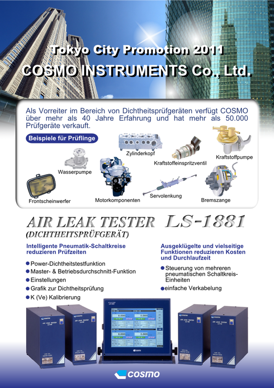 Mit dem Air Leak Tester LS-1881 präsentiert der Meßinstrumentehersteller Cosmo eine intelligente Lösung für die Qualitätssicherung von Automobilteilen, Motorenkomponenten und vielen weiteren Teilen. Mittels Luftdruck ermöglicht das Gerät die Prüfung der Dichtheit der zu untersuchenden Komponenten und erleichtert das Aussortieren fehlerhafter Produkte.