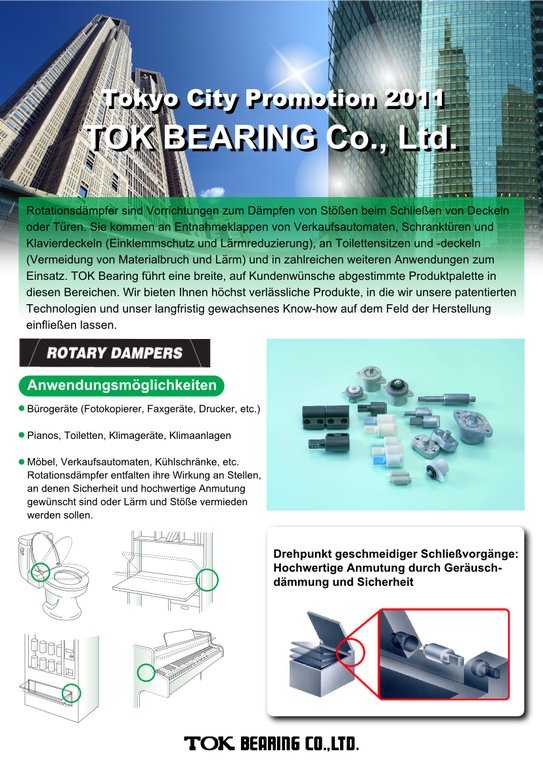 Mit seinen Drehdämpfern wird TOK in Deutschland eine Produktreihe vorstellen, welche zur Dämpfung von Schließbewegungen an Hauben und Türen und damit zur Vermeidung von Stoßschlägen entwickelt worden ist. Sie kommen an Entnahmeklappen von Verkaufsautomaten, Schranktüren und Klavierdeckeln (Einklemmschutz und Lärmreduzierung), an Toilettensitzen und -deckeln (Vermeidung von Materialbruch und Lärm) und in zahlreichen weiteren Anwendungen zum Einsatz.