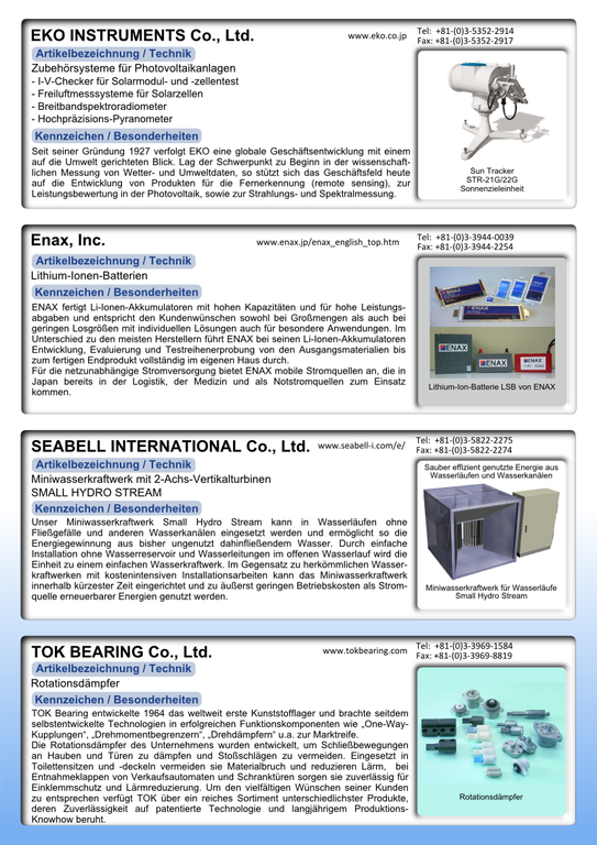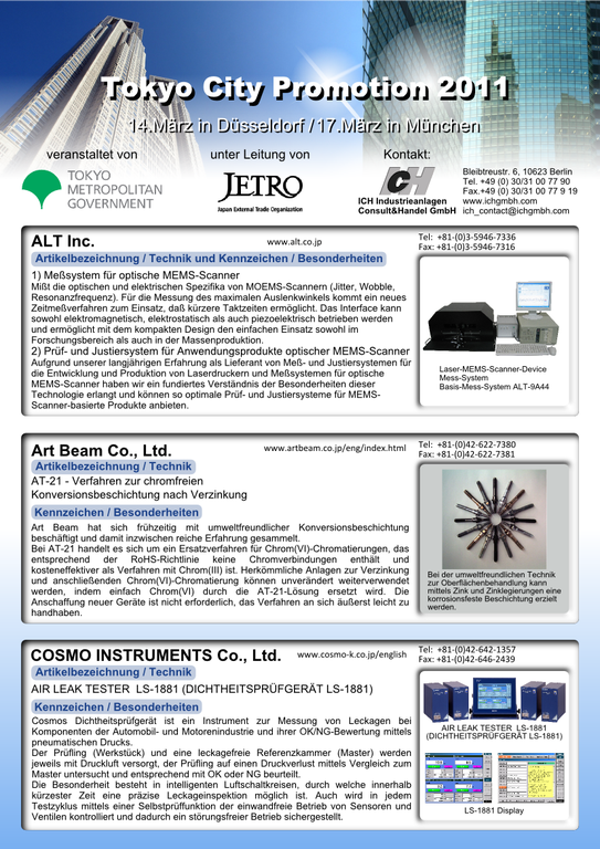 Waren es 2010 vier Tokyoter Unternehmen, so werden 2011 insgesamt sieben Firmen aus der japanischen Metropolregion an der Veranstaltung teilnehmen und neben Düsseldorf ( Montag, 14.03.2011) nun auch in München (Donnerstag, 17.03.2011) die Gelegenheit bieten, im Anschluß an ein einführendes Seminar die sieben mittelständischen Unternehmen aus der Präfektur Tokyo und ihre Technologien näher kennenzulernen und mit ihnen in durch Dolmetscher betreuten Einzelgesprächen in Kontakt zu treten.