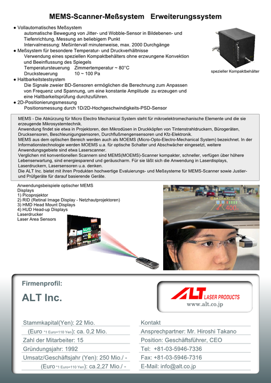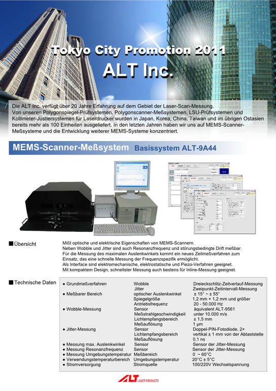 Mit 20jähriger Erfahrung auf dem Gebiet der Laser-Scan-Messung lieferte das Unternehmen ALT Inc. im asiatischen Raum neben Systemen für die Prüfung von Polygonspiegeln und die Messung von Polygonscannern auch Justiersysteme für Kollimeter in Laserdruckern. Hierzu kam in den letzten Jahren eine Spezialisierung auf MEMS-Technologien und Meßsysteme für MEMS-Scanner.