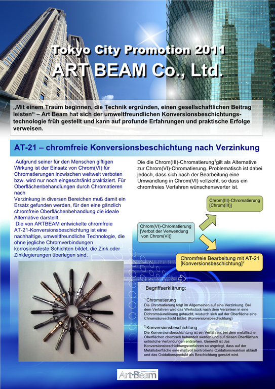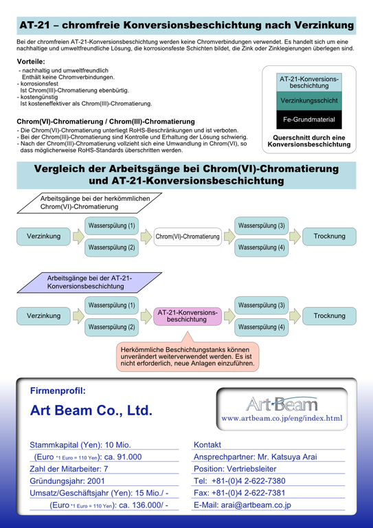 Das junge Unternehmen Art Beam wurde 2001 gegründet und stellt mit seinem „AT-21“ ein umweltfreundliches Ersatzverfahren für Chrom(VI)-Chromatierungen vor, welches vollständig ohne Chromverbindungen auskommt und der RoHS-Richtlinie entspricht. Es ist nicht nur kosteneffektiver als Chrom(III)-Chromatierungen, sondern erlaubt auch die Weiterverwendung herkömmlicher Anlagen zur Verzinkung und anschließenden Chromatierung. Es ist nicht notwendig, neue Maschinen anzuschaffen, statt dessen wird einfach Chrom(VI)-Lösung durch die AT-21-Lösung ersetzt.