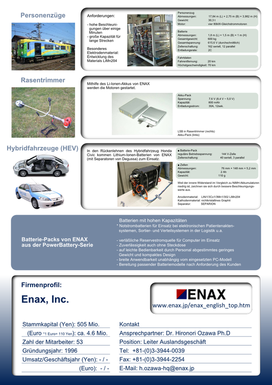 Hohe Kapazitäten und Leistungsabgabe – für diese Anforderungen liefert ENAX mit seinen Lithium-Ionen-Batterien marktreife Anwendungen und paßt bei Großaufträgen wie bei Kleinserien dem Kundenwunsch entsprechend diese auch an spezielle Bedürfnisse an. Im Gegensatz zu vielen anderen Herstellern wird bei ENAX von den Materialien der Akkumulatoren bis hin zum fertigen Produkt Entwicklung, Evaluation, Gestaltung, Prototypenbau und Endprodukt vollständig im eigenen Haus erarbeitet.