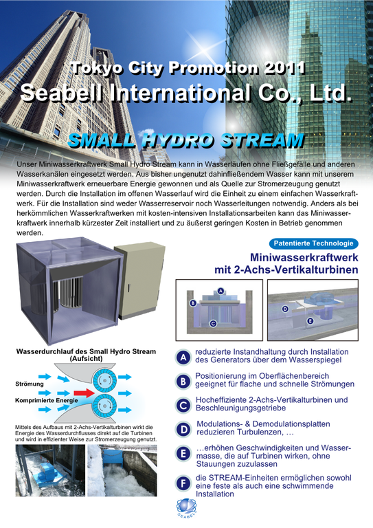 Seabell International stellt mit seinem SMALL HYDRO STREAM ein Miniwasserkraftwerk mit 2-Achs-Vertikalturbinen vor, welches in Wasserläufen ohne Fließgefälle und anderen Wasserkanälen eingesetzt werden kann. Das Miniwasserkraftwerk ermöglicht somit, aus bisher ungenutzt dahinfließendem Wasser erneuerbare Energie zu gewinnen und Wasserläufe als Quelle zur Stromerzeugung zu nutzen.