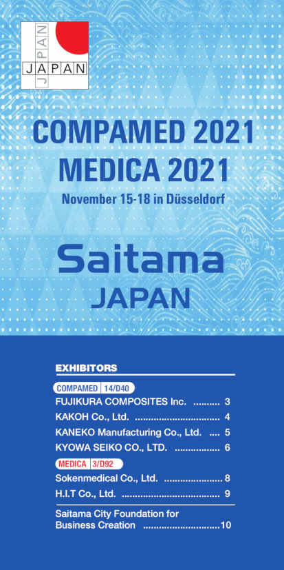 After last year’s virtual COMPAMED and MEDICA, this year both trade fairs will be held again in their usual format from 15 to 18 November 2021 in Dusseldorf, Germany. Six companies from the Japanese prefecture of Saitama will use this opportunity to participate and present their technologies, being successful participants of Compamed/Medica in Dusseldorf and MT-Connect and MedTechLive in Nuremberg in recent years.